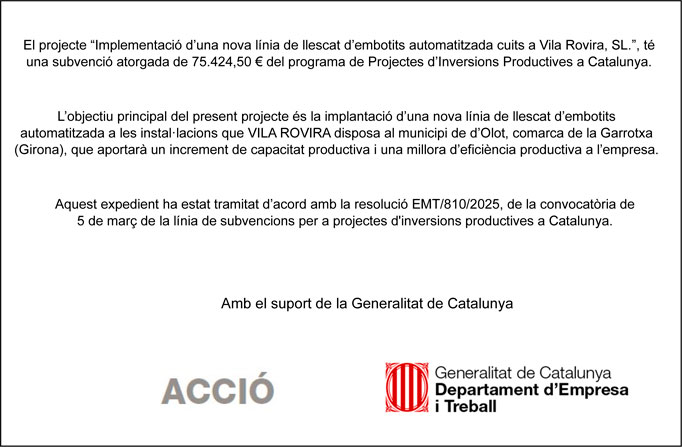 El proyecto "Implementación de una nueva línea de loncheado de embutidos automatizada cocidos en Vila Rovira, SL.", tiene una subvención otorgada de 75.424,50 € del programa de Proyectos de Inversiones Productivas en Cataluña.